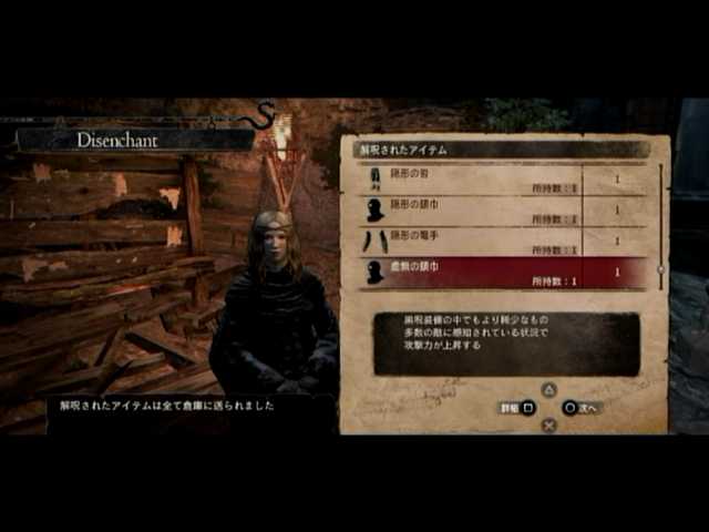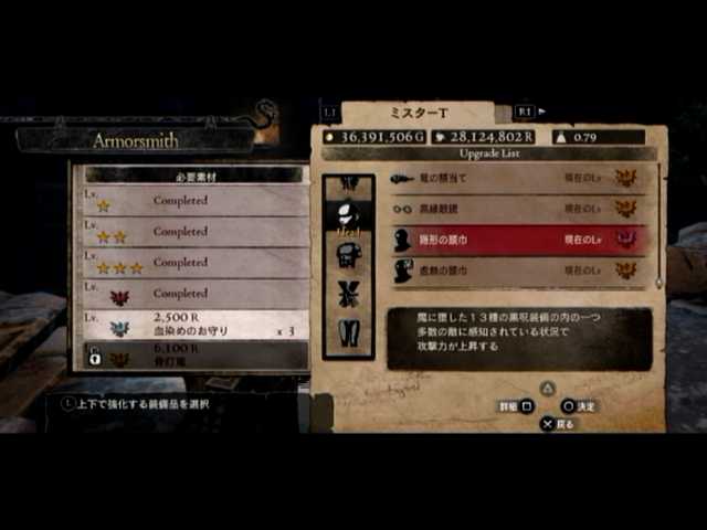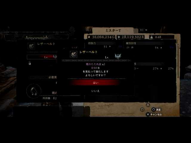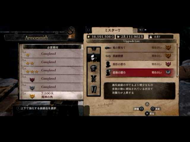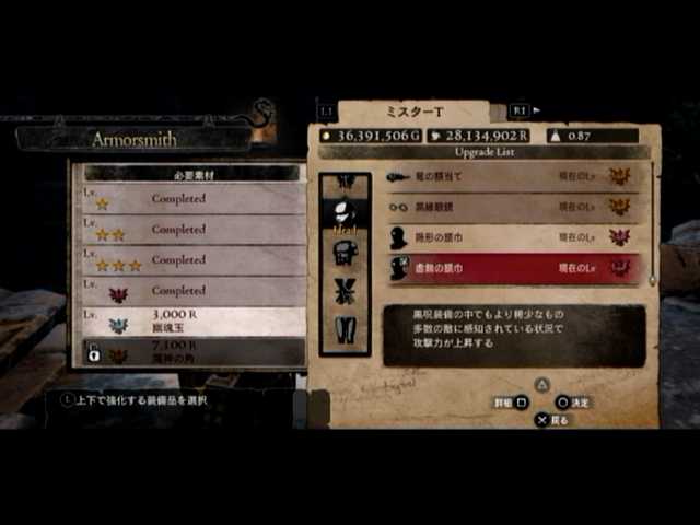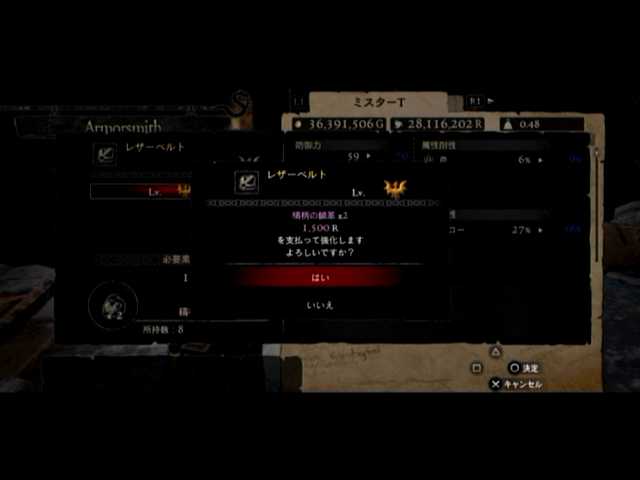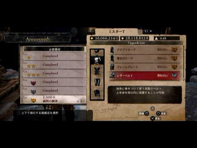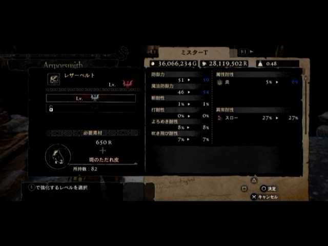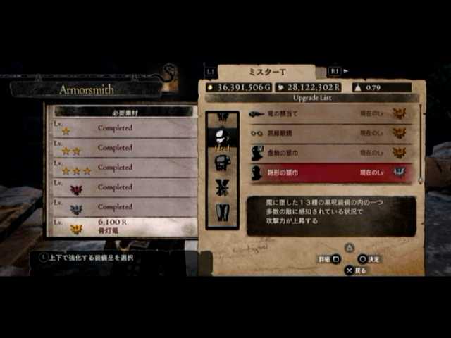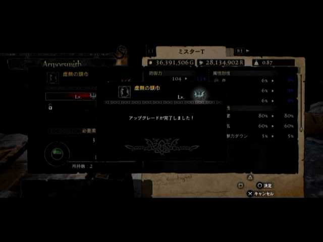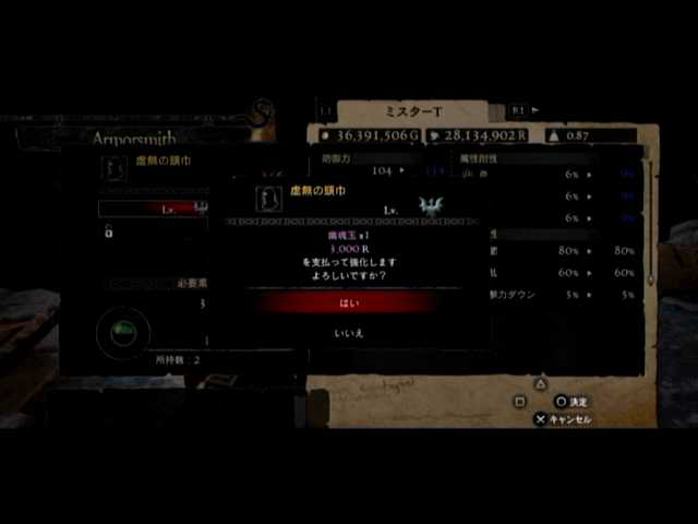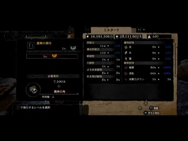 通常の密輸以外に、ファーストは頭装備と胸装備の強化をば。頭装備は虚無の頭巾、胸装備はレザーブレストです。前者の方は