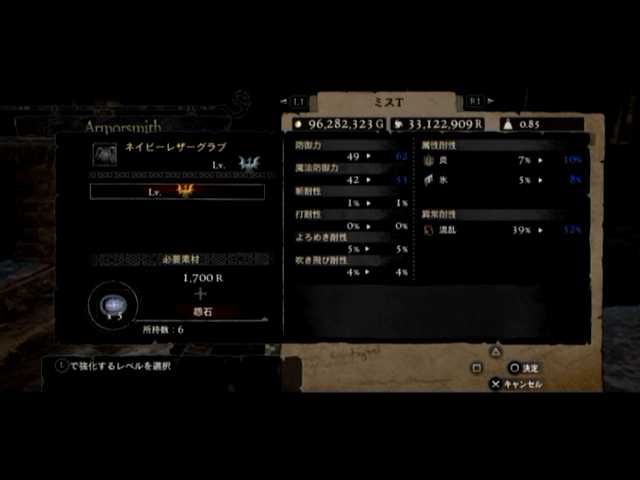 とりあえず、ファーストはネイビーレザーグラブとダマスクスプレートをLV6に。2つとも混乱耐性が劇的にアップしたので、